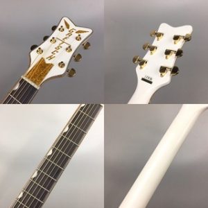 ゴールドペグやストラップピン、ピックガードやヘッドインレイなどホワイトカラーと相まって高級感のあるルックスとなっています。